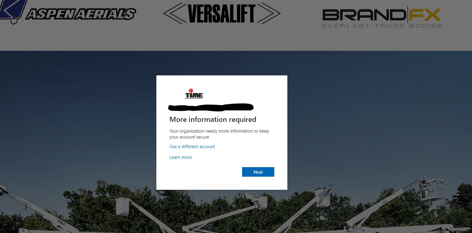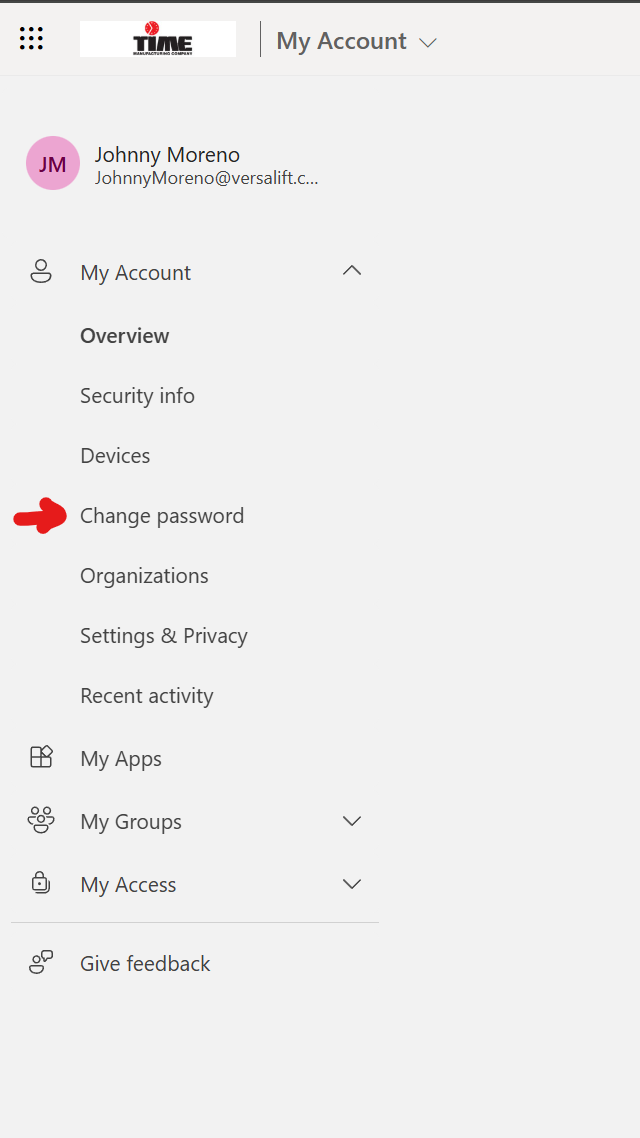 2. Sign in to https://myaccount.microsoft.com/ with your assigned Time/Versalift work account. If you have not set your Multi Factor Authentication (MFA) you will need to set it up at this time. Follow the prompts and select the MFA method you would like to use such as the Authenticator App. You will need this alternate method of authentication every time you log into your O365 portal.