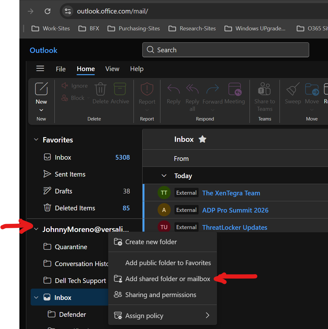 1. Open the Outlook application on your computer. Navigate to the left pane of your Home page. You'll notice your inbox and favorites towards the top. If you scroll down you'll see the different shared mailboxes in which you have access into.