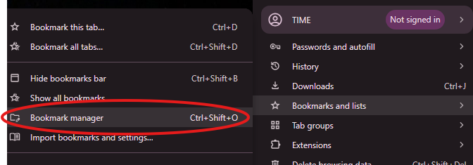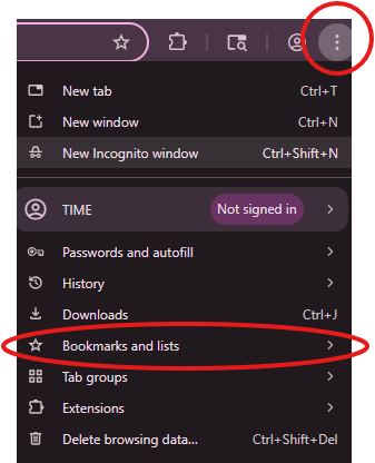 Step 1. On the browser of your choice, select the 3 dots in the top right corner. Then Navigate to Bookmarks and lists then Bookmark manager.