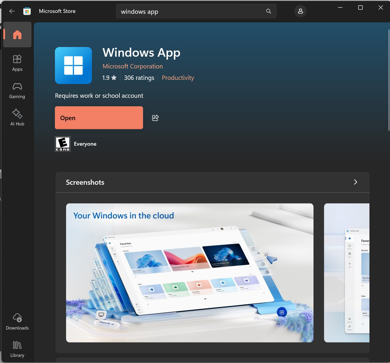 1. Search for the Microsoft Store on your computer and select to open > Search for the “Windows App” application as shown below > Select the “Get” bar to start the download/Install process.