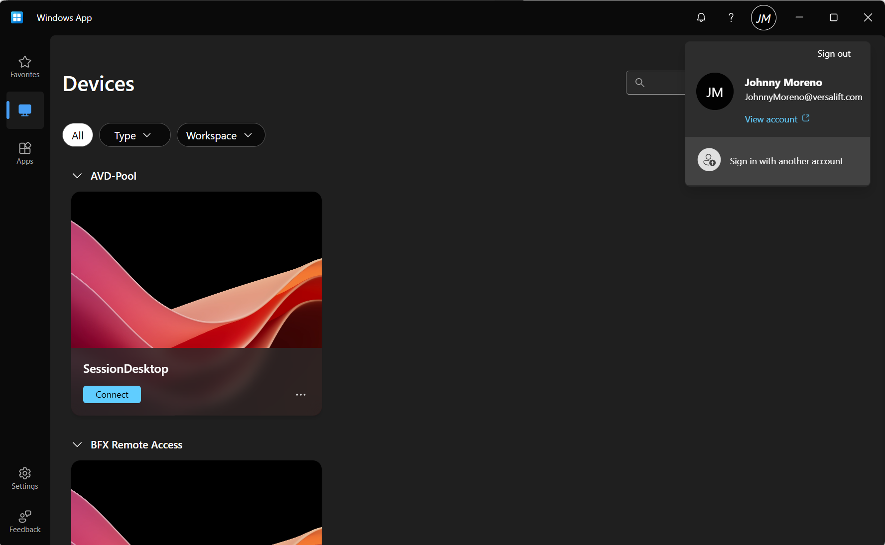 3. Once the Application is opened, you’ll notice that the Windows App installed is automatically logged in using your computers Windows account. Depending on account type, you’ll need to make sure you are using the account created for the Azure Virtual Desktop Environment. You can select sign out and then sign in using the account provided by the Administrator through an Encrypted email for this specific service.