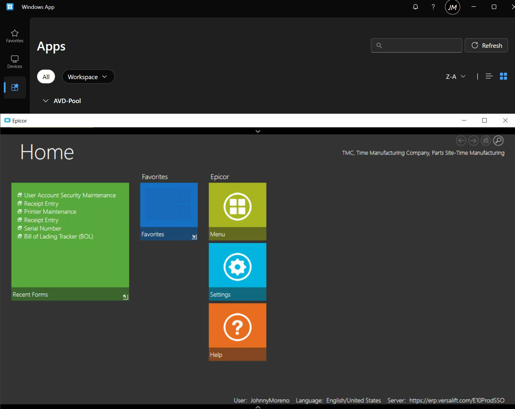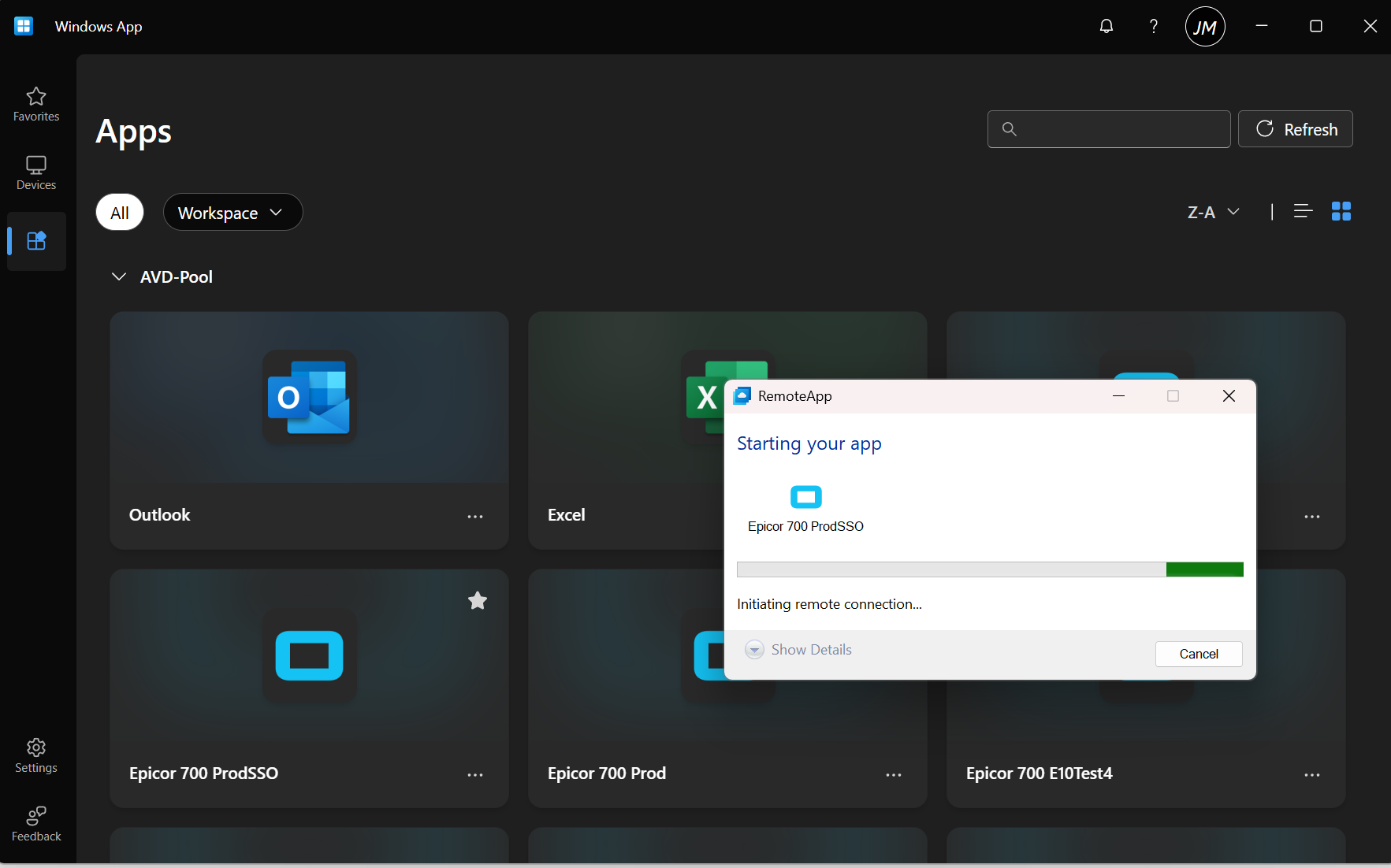 4. Once it is confirmed that the correct account is signed in you can then navigate the virtual applications in which access was provided. Navigate to the left pane > Select Apps Icon (Below the Devices Icon) > Select and open the application required.